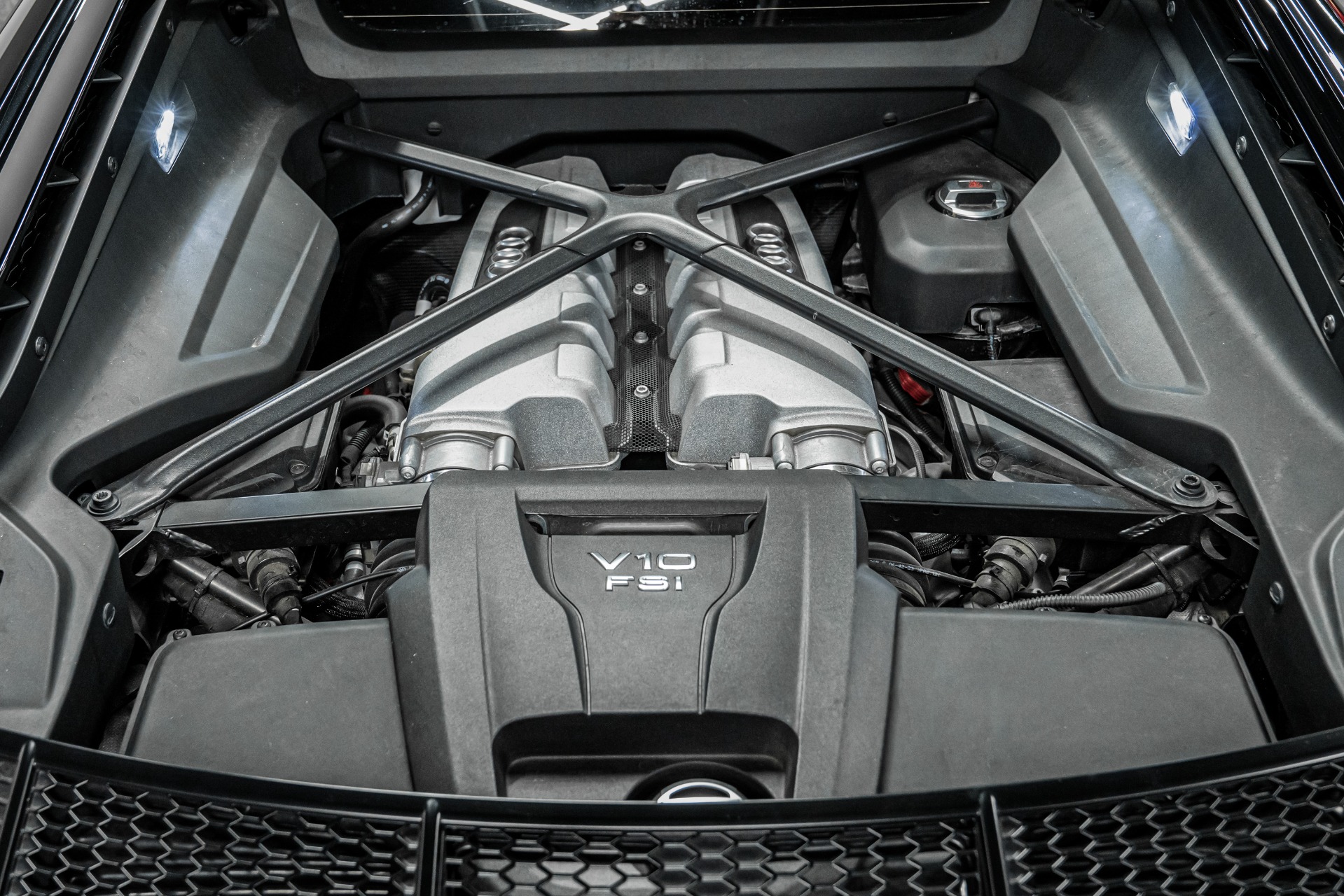 The heart of this machine pulses with a naturally aspirated 5.2-liter DOHC V10 powerplant, delivering an intoxicating 562 horsepower and 406 lb-ft of torque through Audi's lightning-quick 7-speed S tronic dual-clutch transmission. Diamond-turned 20-inch wheels wrapped around red brake calipers hint at the performance prowess within.