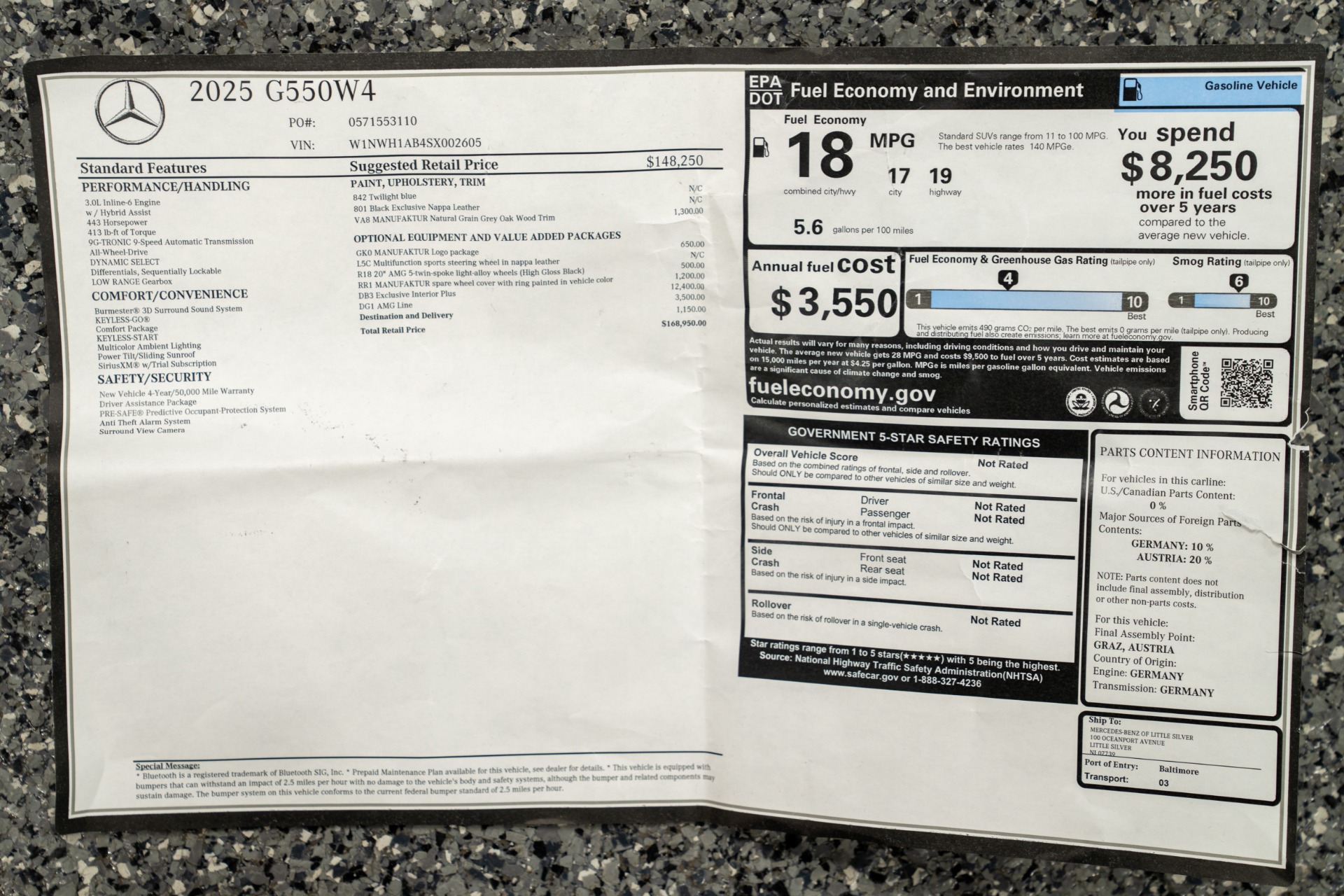 Experience automotive royalty with this virtually pristine 2025 Mercedes-Benz G550, adorned in the sophisticated Twilight Blue Metallic and protected by comprehensive matte paint protection film. With merely 5,605 pampered miles, this exceptional SUV represents the pinnacle of German engineering and luxury craftsmanship.