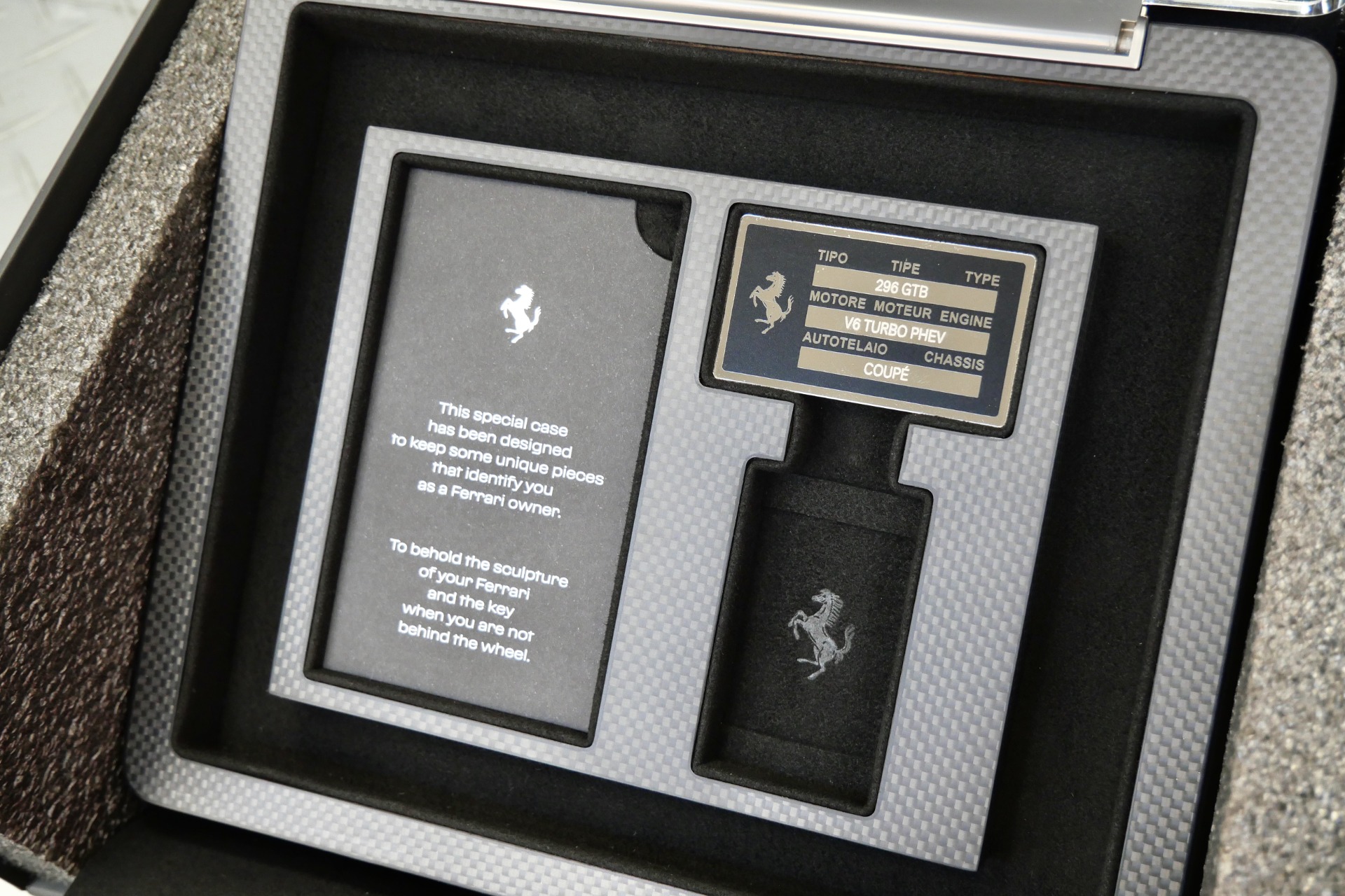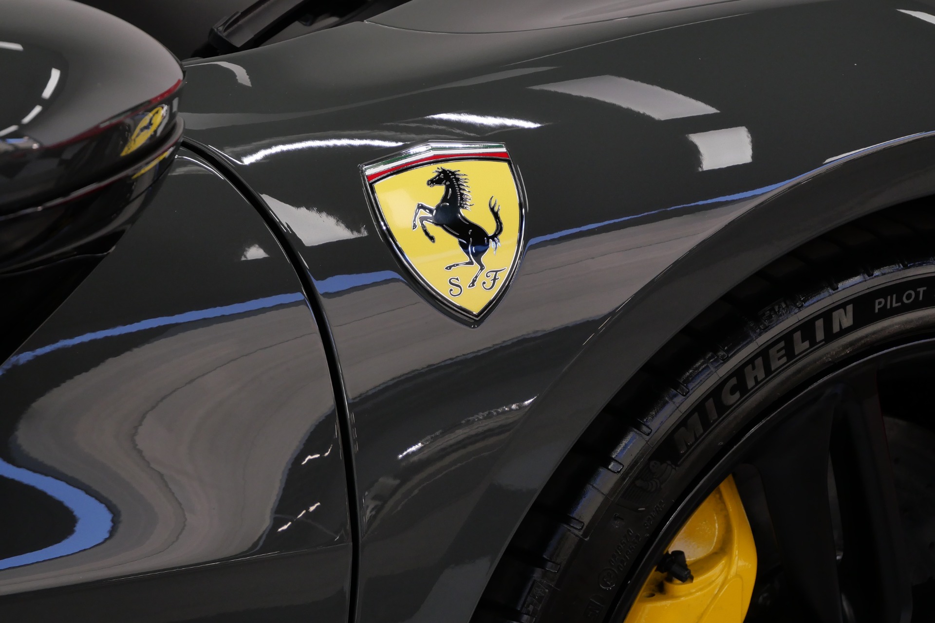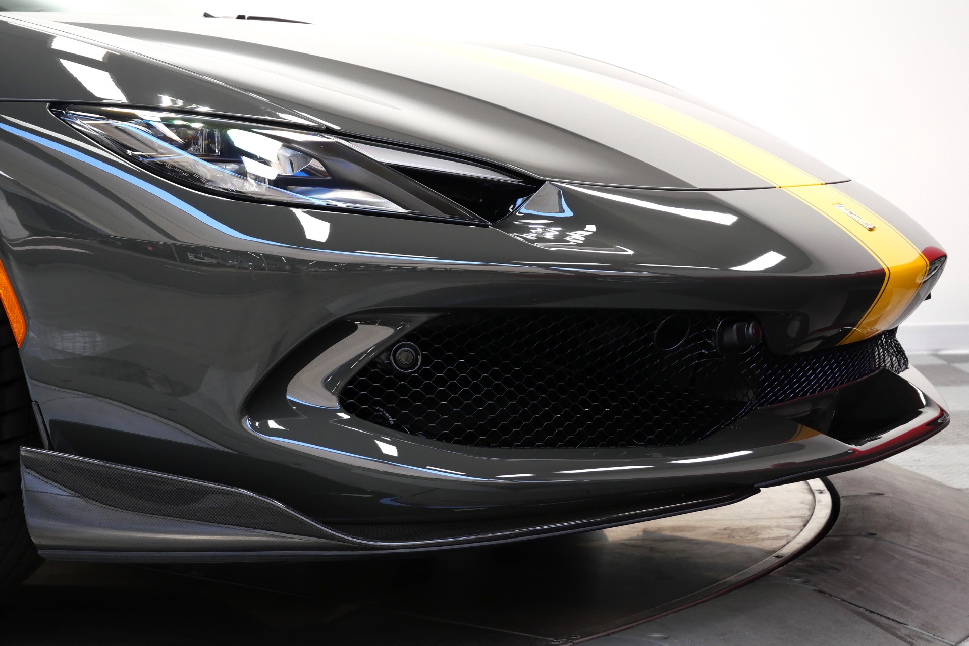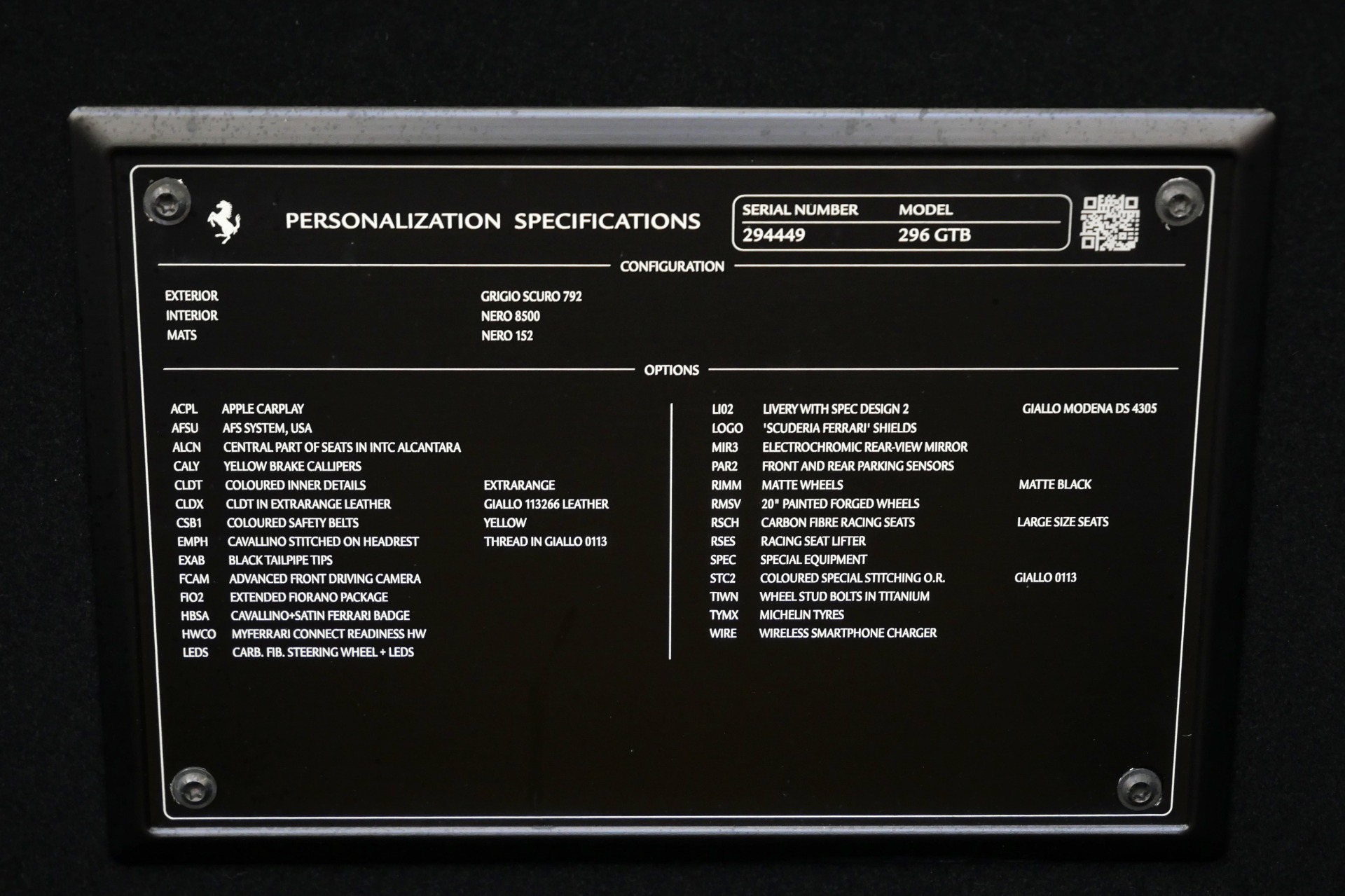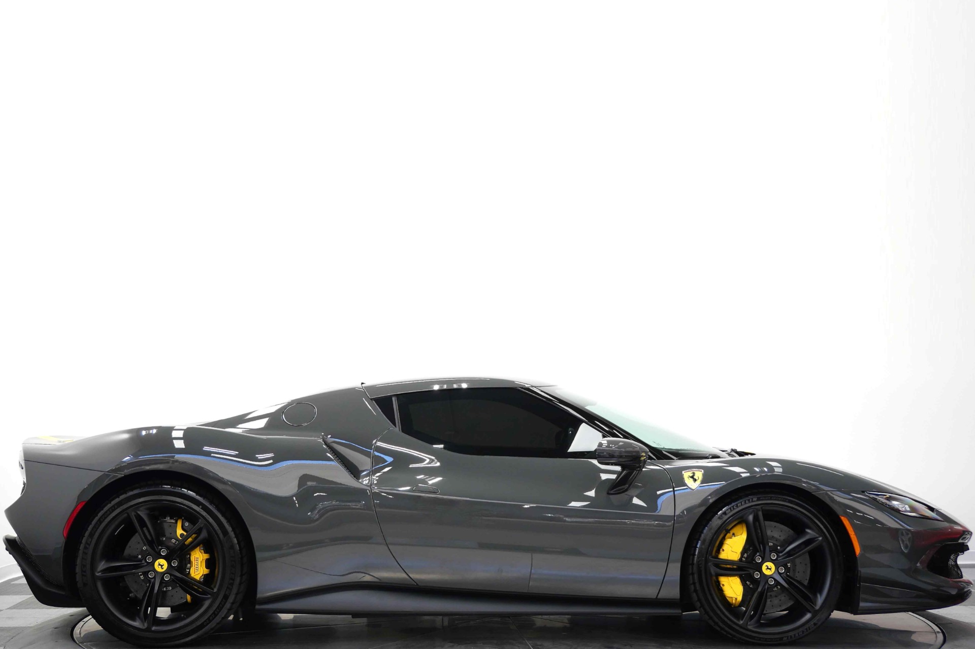 2023 Ferrari 296 GTB -Livery stripes, Carbon Fiber Racing Seats, Yellow Stitching (Grigio Scuro) For Sale