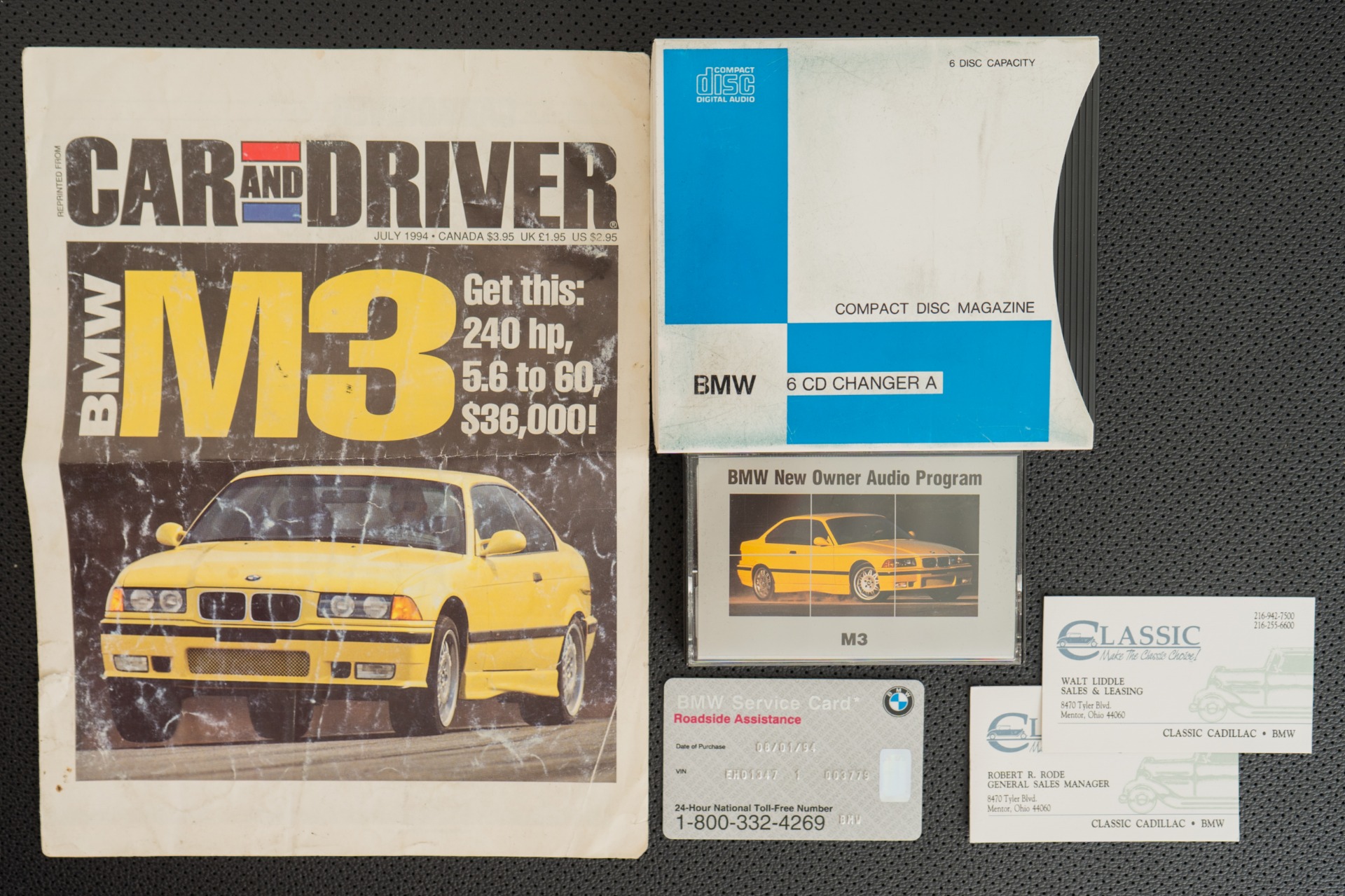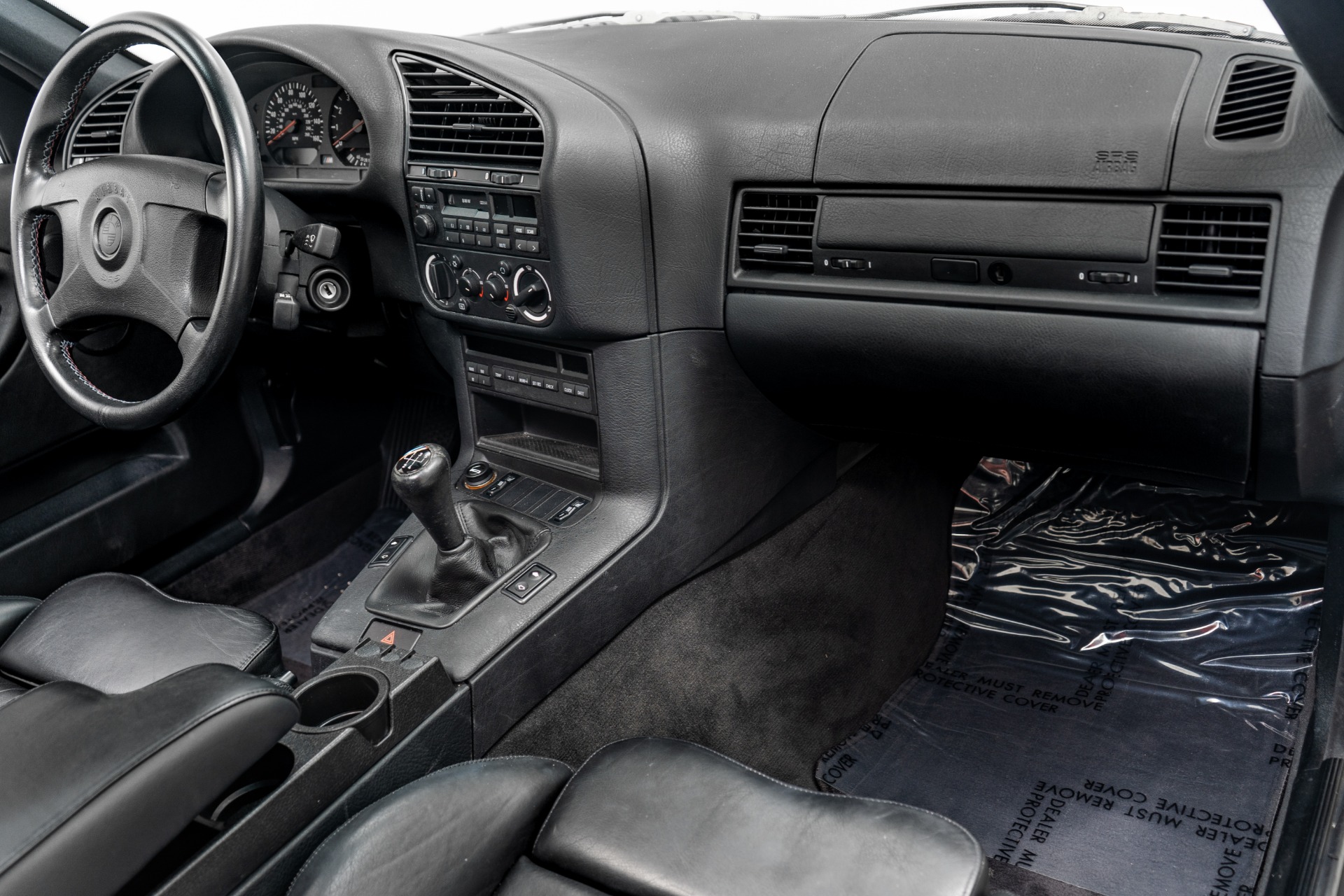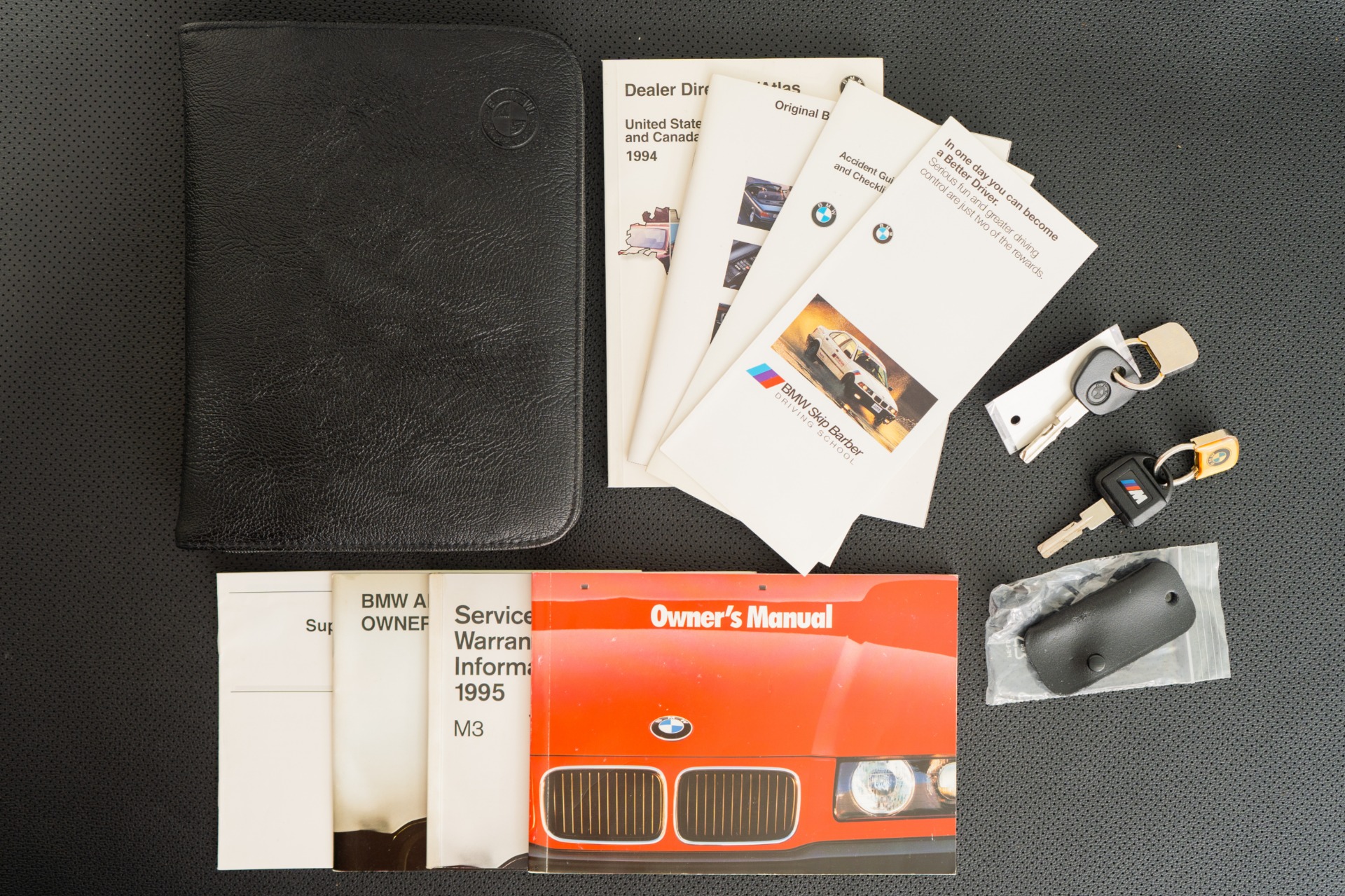 Every detail whispers authenticity: commanding 16-inch DS1 wheels, power sunroof, iconic manual "Vader" sport seats with front heating, cruise control, and the period-correct BMW cassette stereo complemented by a 6-disc changer. The comprehensive documentation reads like a collector's dream—original window sticker, bill of sale, odometer statement, complete owner's manuals, both master keys, and invoices for dealer-installed accessories including the front bra and center armrest.