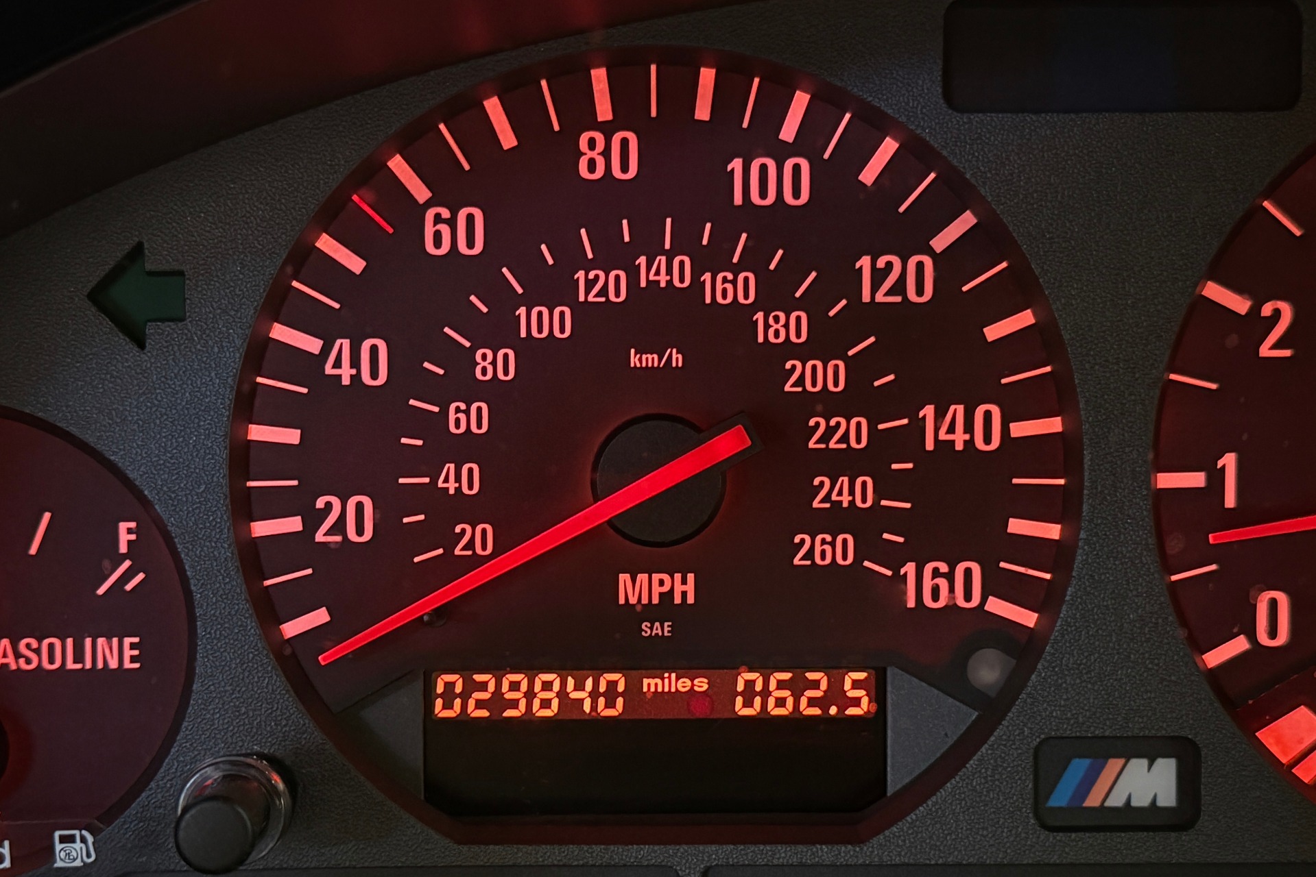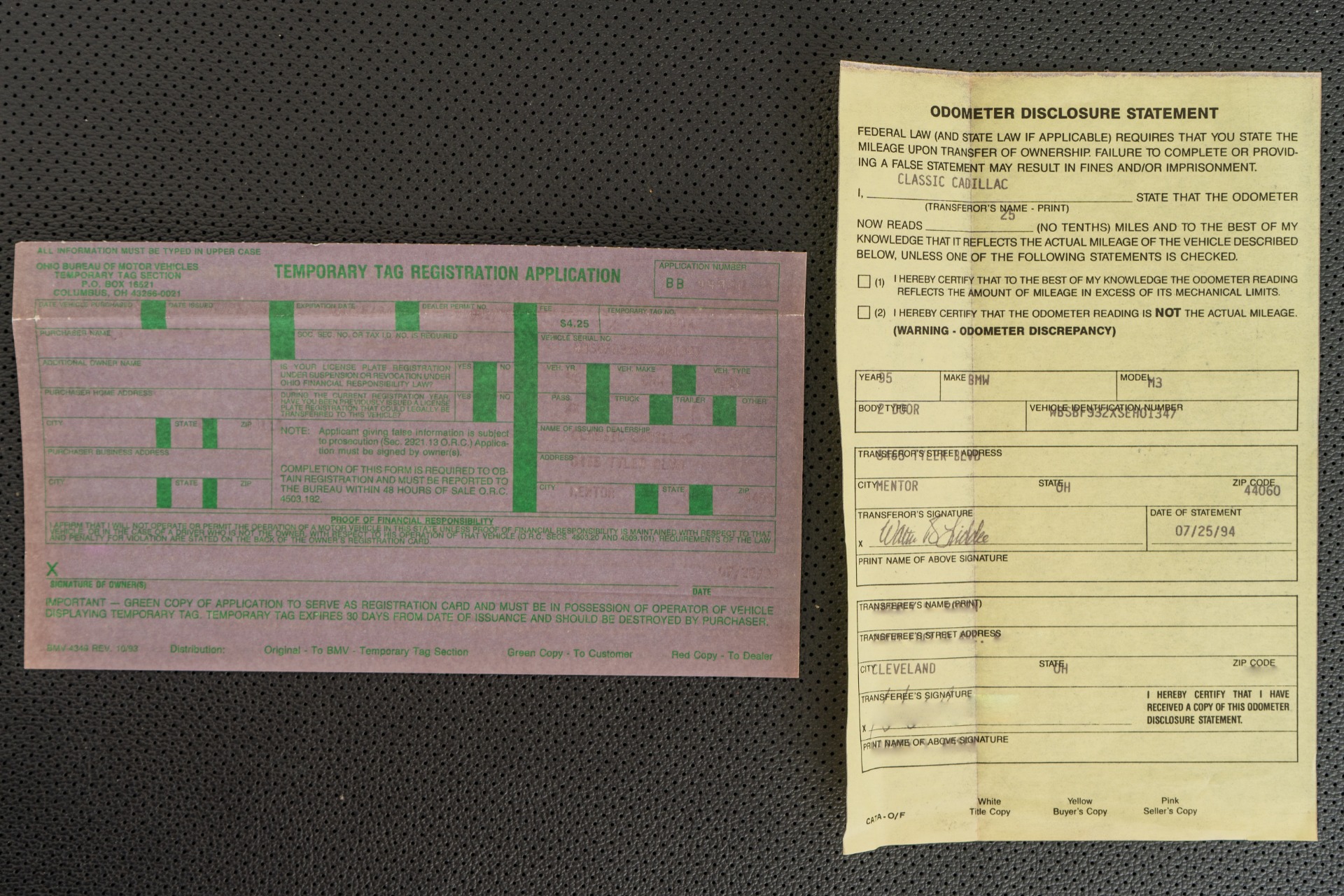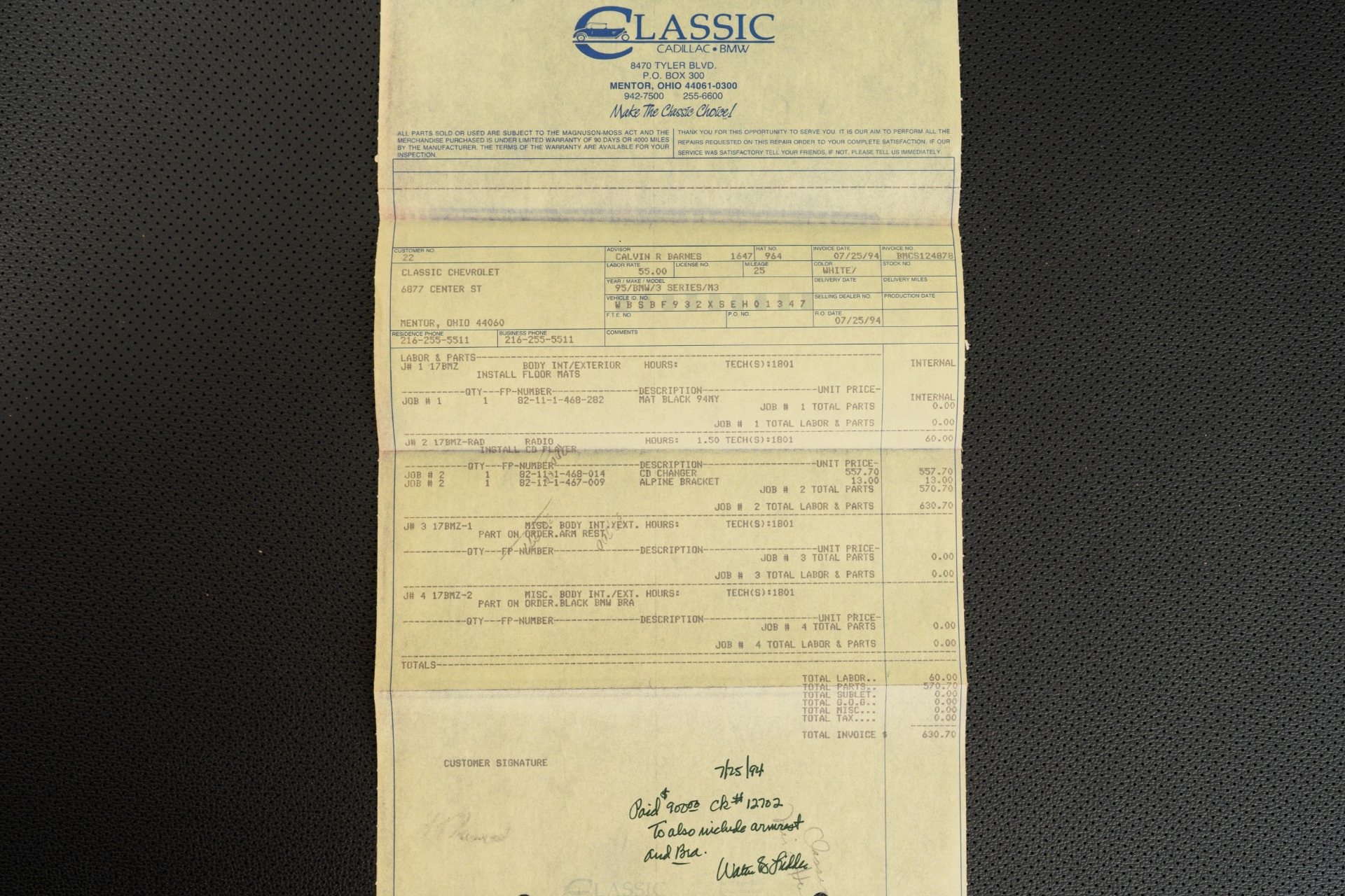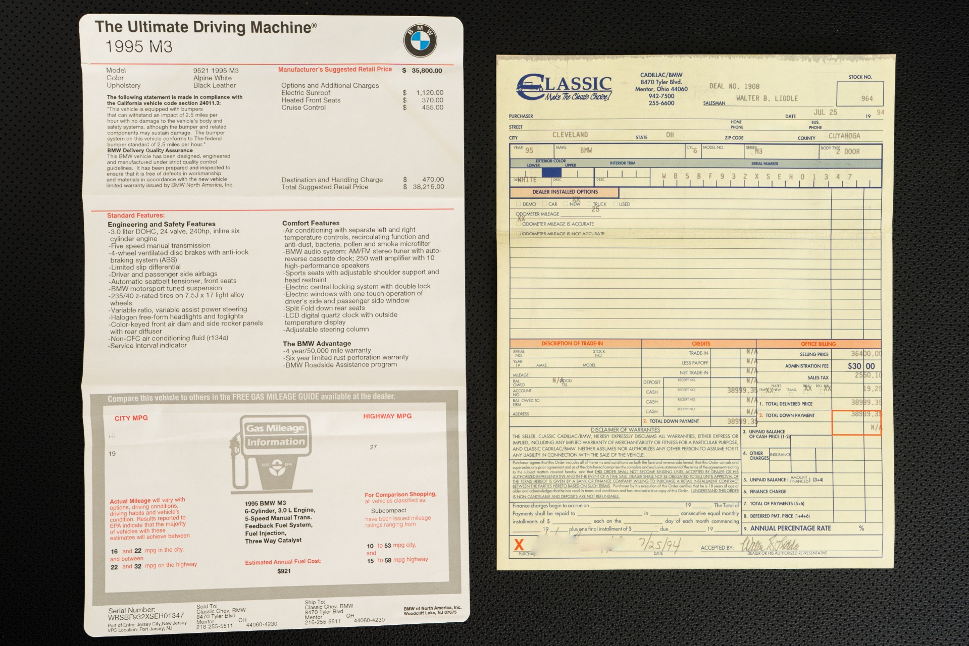 Every detail whispers authenticity: commanding 16-inch DS1 wheels, power sunroof, iconic manual "Vader" sport seats with front heating, cruise control, and the period-correct BMW cassette stereo complemented by a 6-disc changer. The comprehensive documentation reads like a collector's dream—original window sticker, bill of sale, odometer statement, complete owner's manuals, both master keys, and invoices for dealer-installed accessories including the front bra and center armrest.
