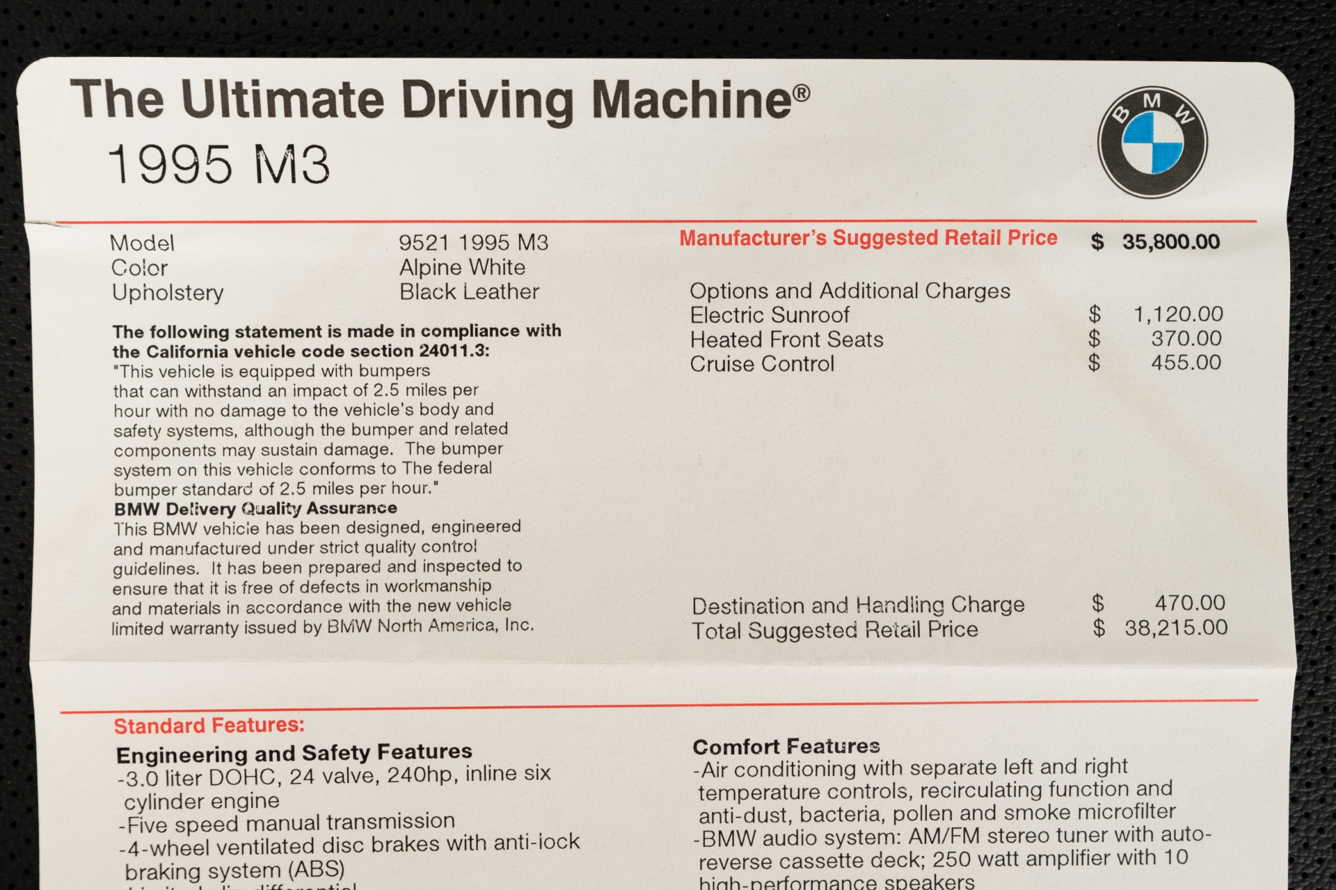 1995 BMW M3 -Highly Original, Sales Paperwork, Window Sticker (Alpine White) For Sale