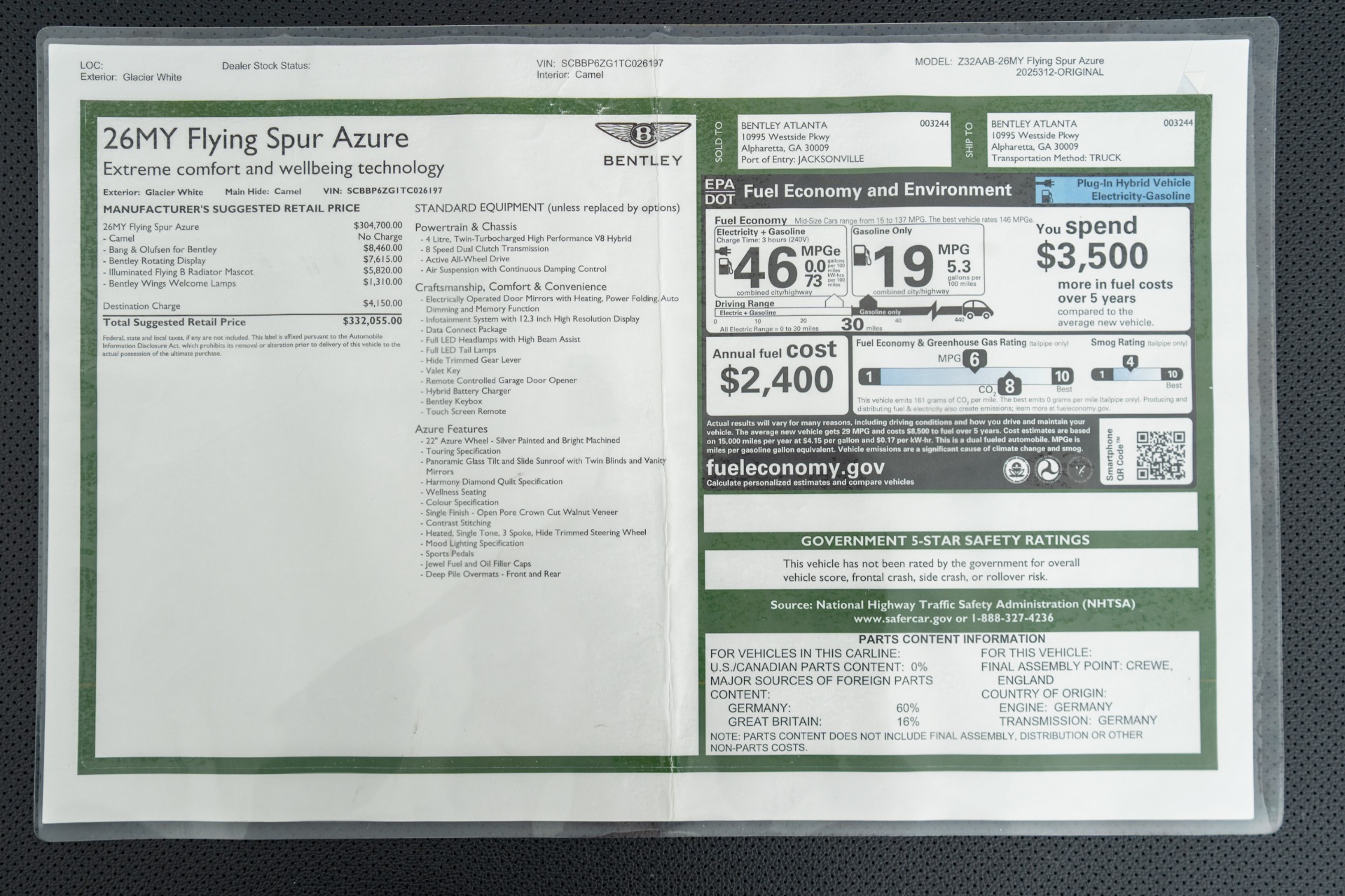 Witness automotive artistry in its purest form with this virtually pristine 2026 Bentley Flying Spur Azure, adorned in ethereal Glacier White with sumptuous Camel leather appointments and a mere 39 delivery miles.